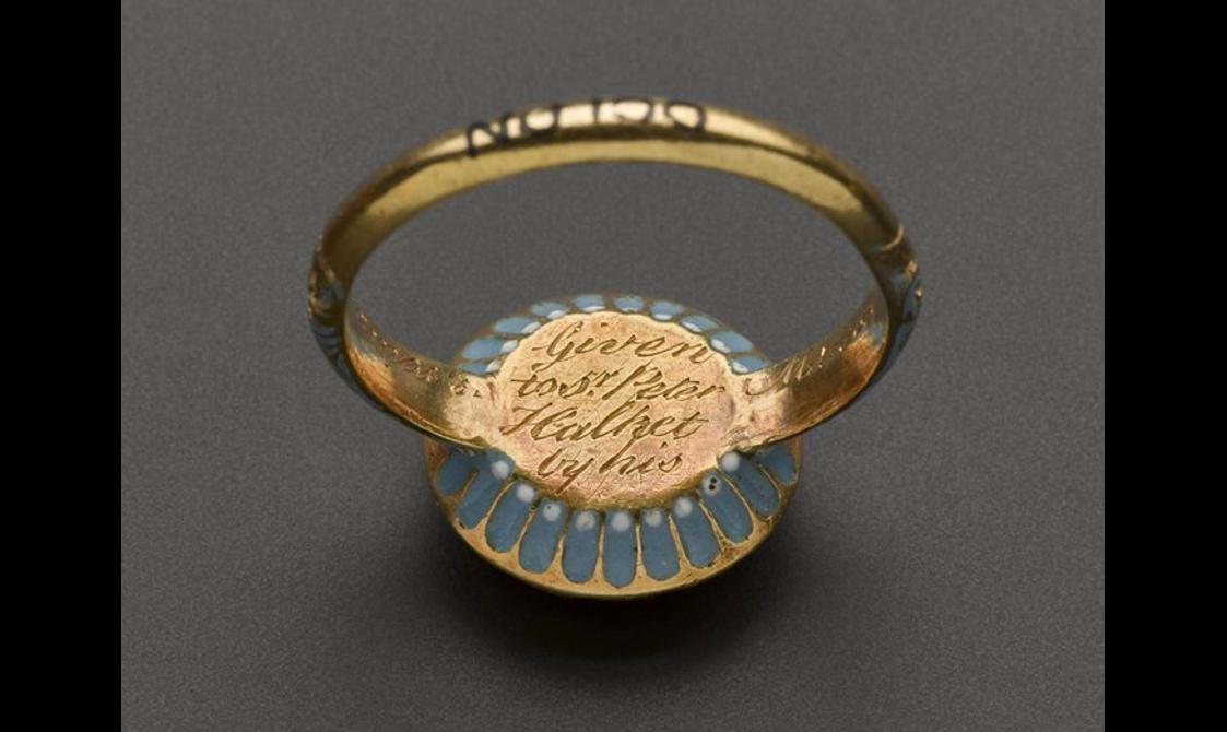 This ring (museum reference H.NJ 100) is said to have been given to Sir Peter Halkett by James VII and II on the night the king fled from London in 1688. With the monarch’s crowned monogram (JR) and possibly containing his hair, it would have been an appropriate memento of the exiled James.