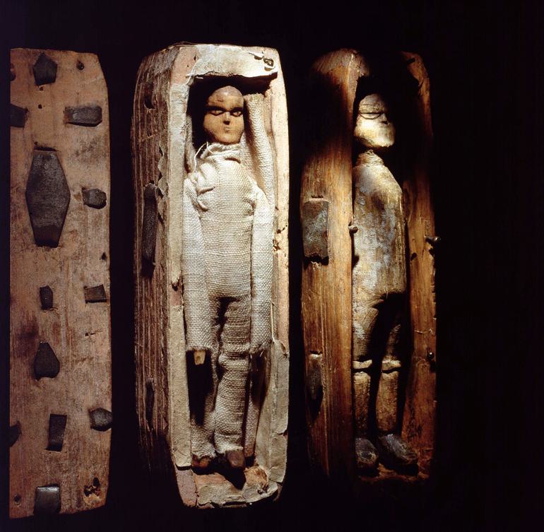 Each coffin - only 95mm in length - contained a little wooden figure. The figures were carved and dressed in clothes that had been stitched and glued around them.