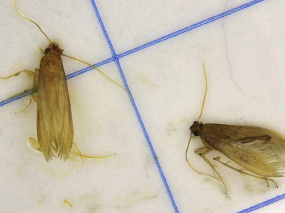Image caption: Brown House Moths (Hofmannophila pseudosprettela) are identifiable by their size and dark markings.
