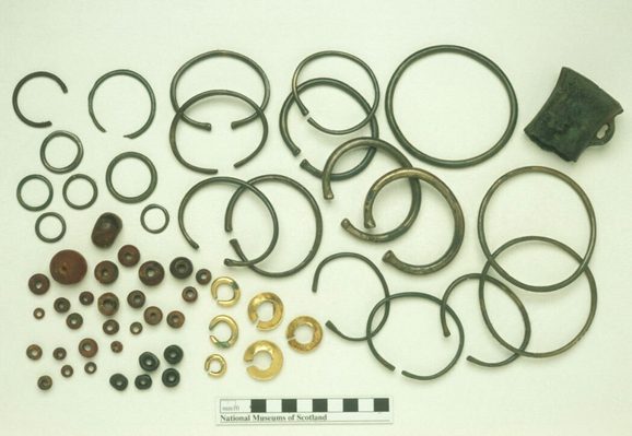 The Balmashanner hoard containing bronze, amber and gold objects.