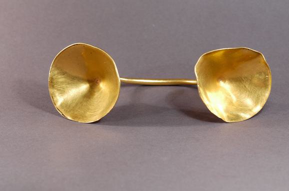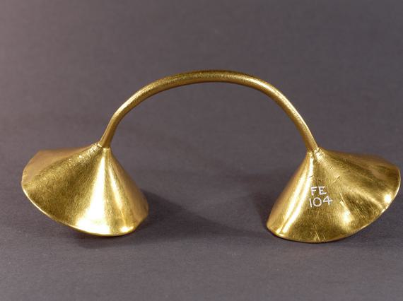 To make this object, the thin ‘cups’ of gold must have been soldered or cast onto the narrow curved gold bar. It required a skilled craftsperson and certainly would have been striking however it was worn. This form of object was (almost!) always made out of gold and dates to the Late Bronze Age, around 1000–800 BC.