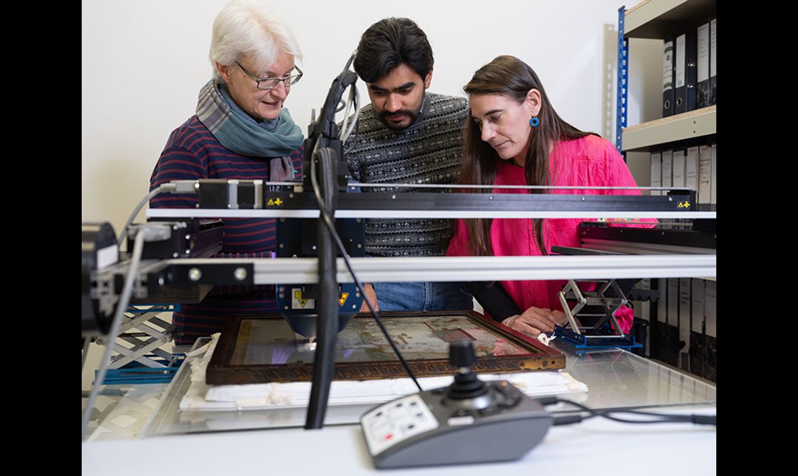 Conservators and curator discussing one of the frames at the paper conservation studio in the National Museums Collection Centre.