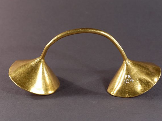 To make this object, the thin ‘cups’ of gold must have been soldered or cast onto the narrow curved gold bar. It required a skilled craftsperson and certainly would have been striking however it was worn. This form of object was (almost!) always made out of gold and dates to the Late Bronze Age, around 1000–800 BC.