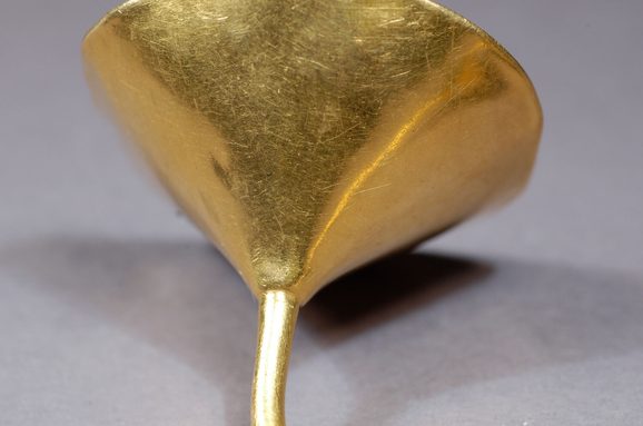 The Skye ornament weighs about 74g and is 136mm wide. The cups are approximately 50mm in diameter each, though one is slightly deformed due to the thinness of the gold. The inner rims of the cups have incomplete, irregular flanges. Could this mean that this ornament was unfinished when it was deposited? Or not as carefully finished as other similar ornaments? Or had the flanges been partly worn away? We don’t know.