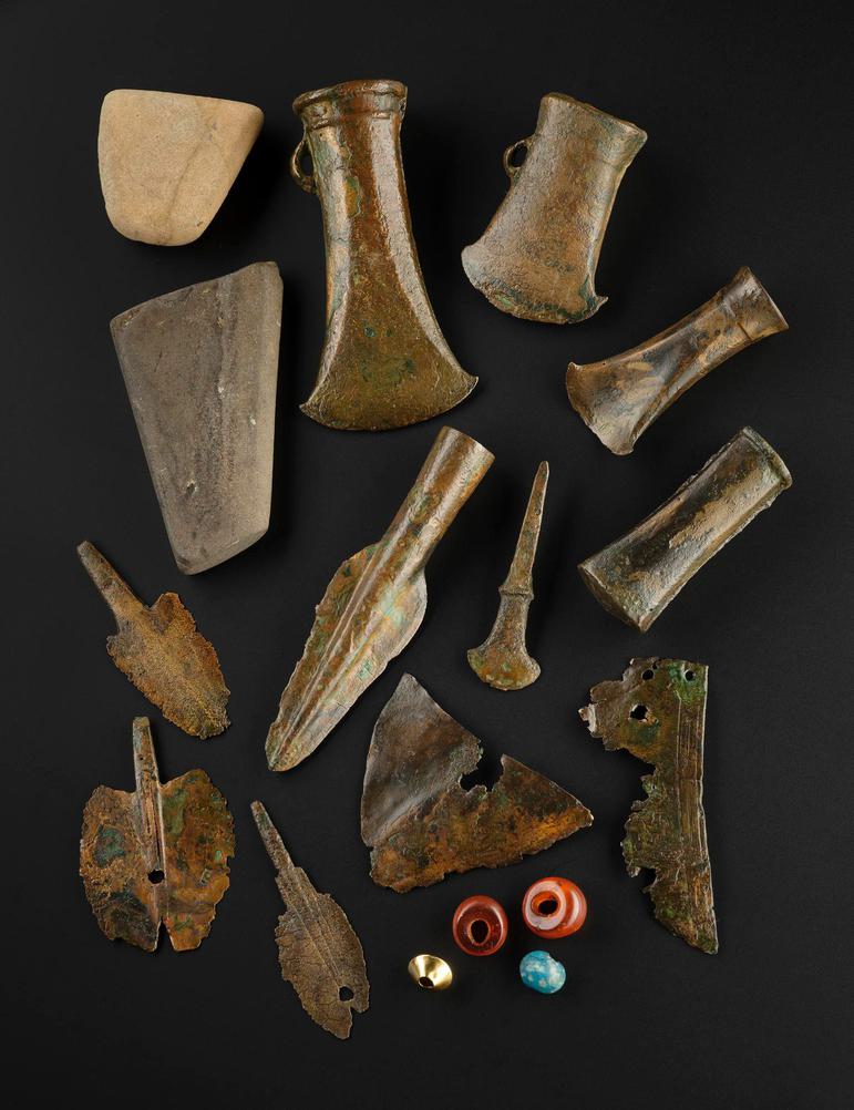 It contains bronze axeheads, spearheads, tools and razors, as well as a decorated bronze vessel, whetstones, and beads made of glass, amber and gold. The hoard can be broadly dated to around 1000–800 BC, the same period as the Skye cup-ended ornament and the Colaton Raleigh bracelets.
