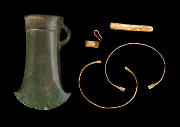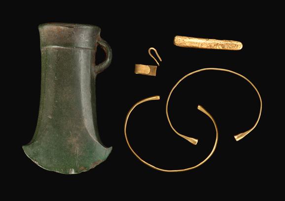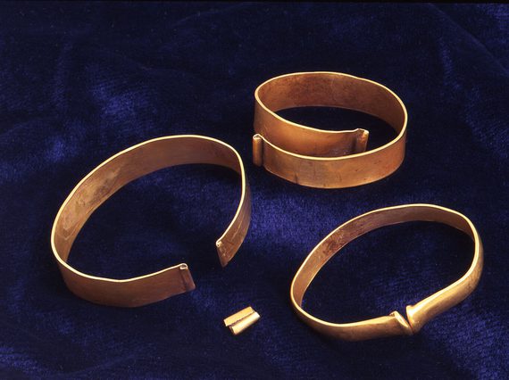 The hoard dates to the Late Bronze Age (1000-800 BC) and consists of three gold bracelets and a clipped fragment of gold sheet. These were buried ‘nested’ one inside the other.