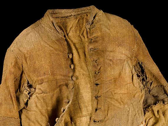 The man was wearing a long thigh-length jacket. It was fitted over the chest but flared out from the waist, with a central back seam, and a vent. This design allows us to date it to the early 18th century. The jacket was made from a woven woolen cloth that is now stained light brown by the peat it was buried in. It is likely that the cloth had been produced locally, even possibly by the man’s own family. The jacket was fastened with eleven cloth ball buttons running from the standing collar at his neck to his waist. Further buttons secured his cuffs and the one large pocket on the left hand side.