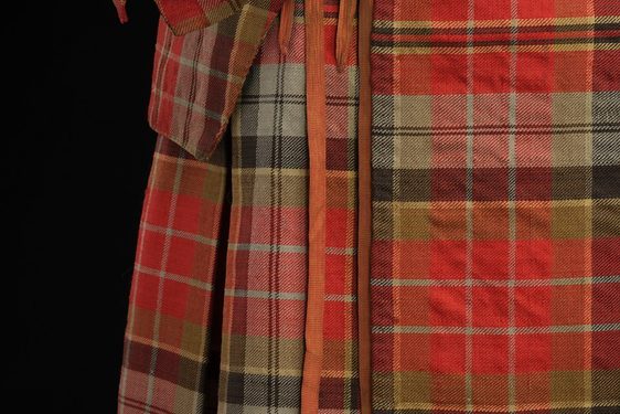 The suit of Highland dress acquired from Gordon Nicolson Kiltmakers, Edinburgh, captures the company’s distinct approach to Highland wear for hire. The hire package centres on the ‘John Muir Way’ tartan. This pattern was designed by, and is available exclusively through, Gordon Nicolson Kiltmakers. The pattern commemorates the opening of a 134-mile coast to coast walking and cycling path from Dunbar to Helensburgh in 2014, named after conservationist John Muir. The colours chosen to create the tartan are an ode to the coastline of East Lothian, echoing its red stone cliffs, bright blue seas and skies, and the greens and browns of the surrounding countryside.