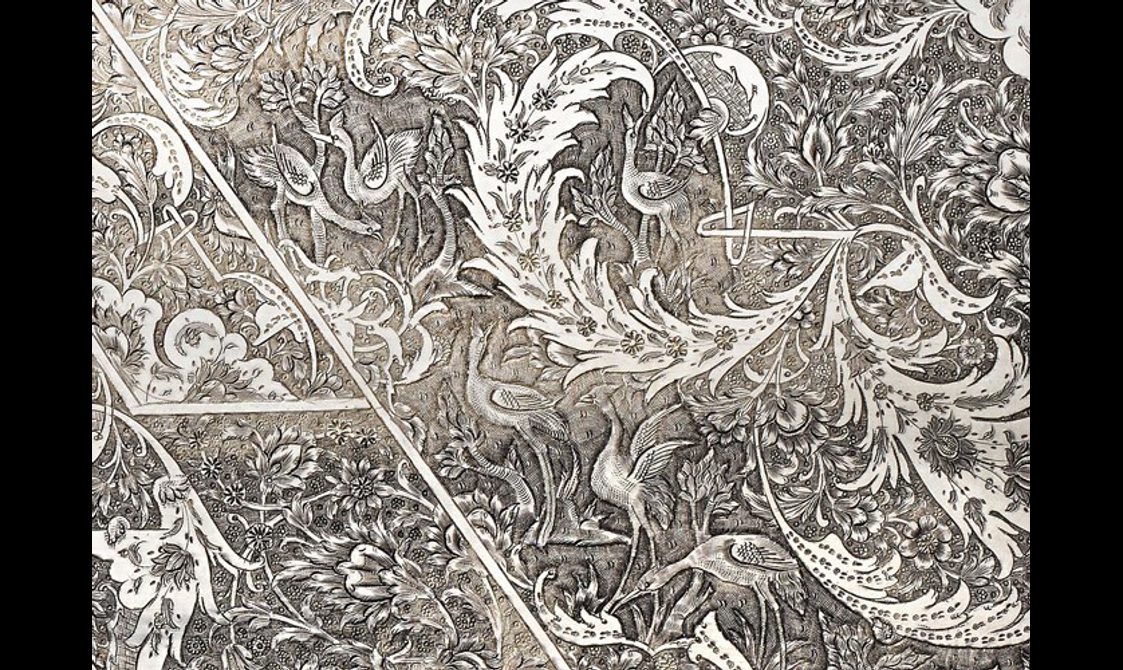 Rectangular tray of silver with an asymmetrical pattern depicting a landscape with trees and cranes overlaid with fine curved leaves and flowers, with an embossed edge, hallmarked on the reverse, Iran, Isfahan, 1920s-1940s. Museum reference V.2015.64.